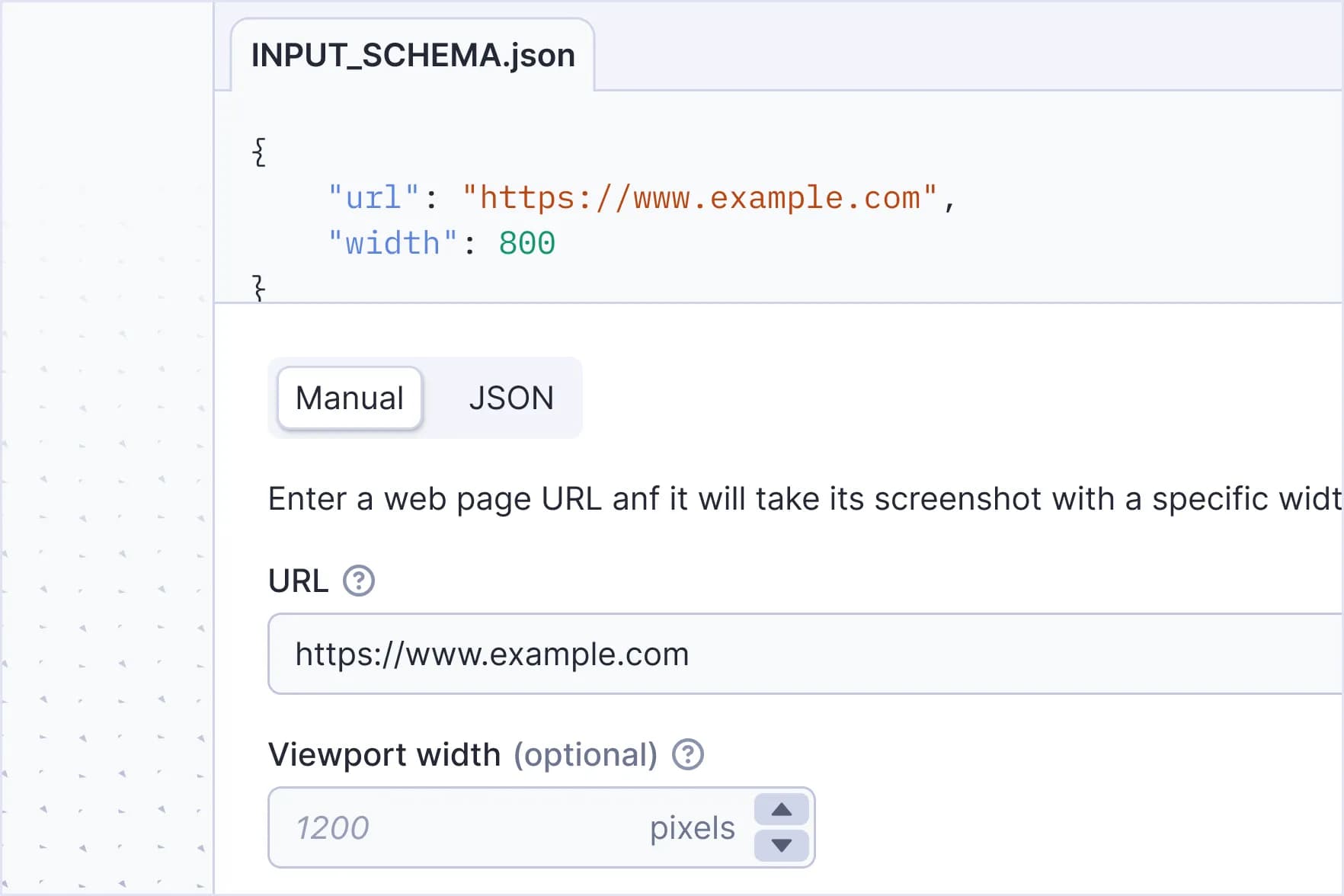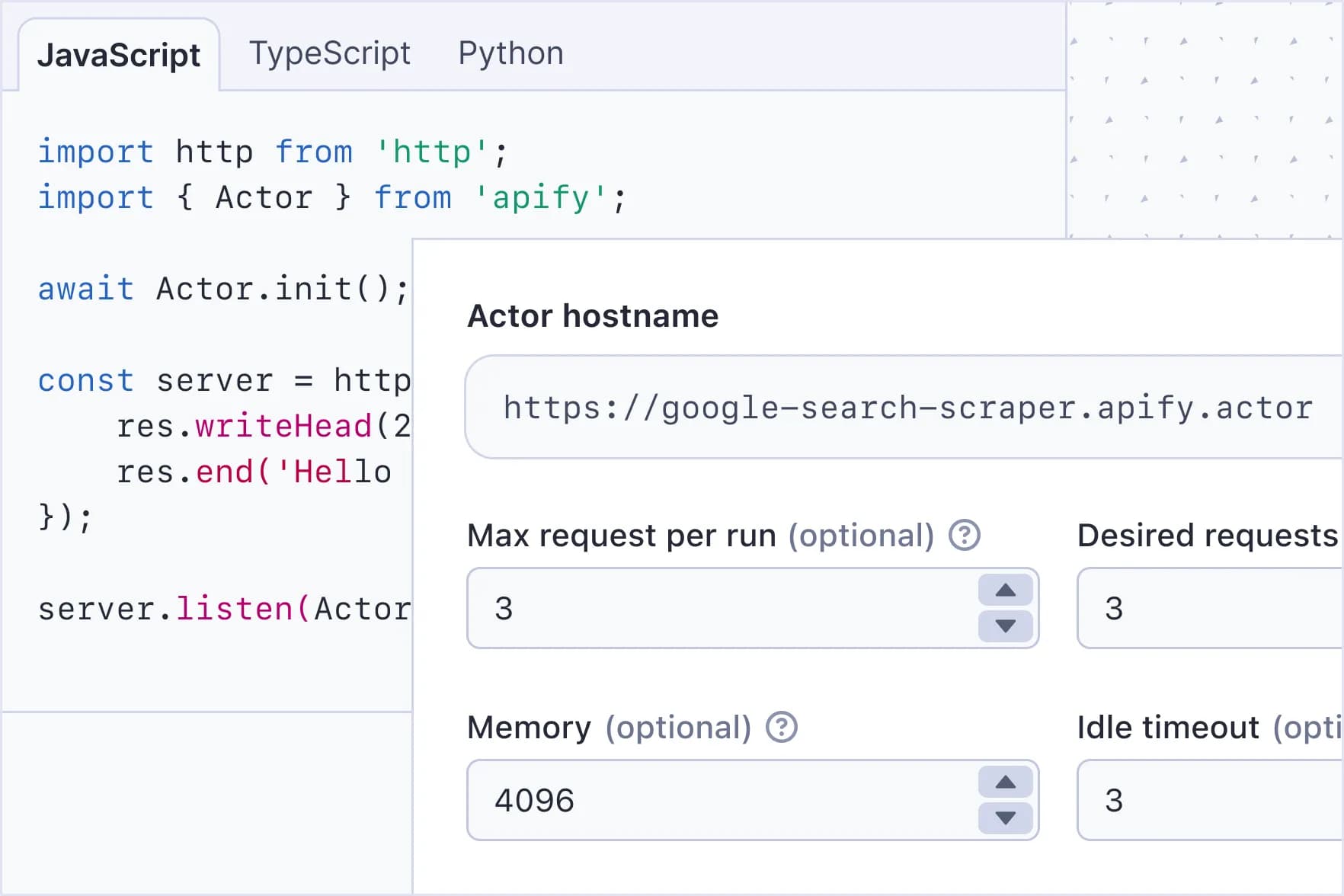 Actors can easily define a user interface for their input configuration. Take advantage of lower-level features and settings, or run Actors using our API.