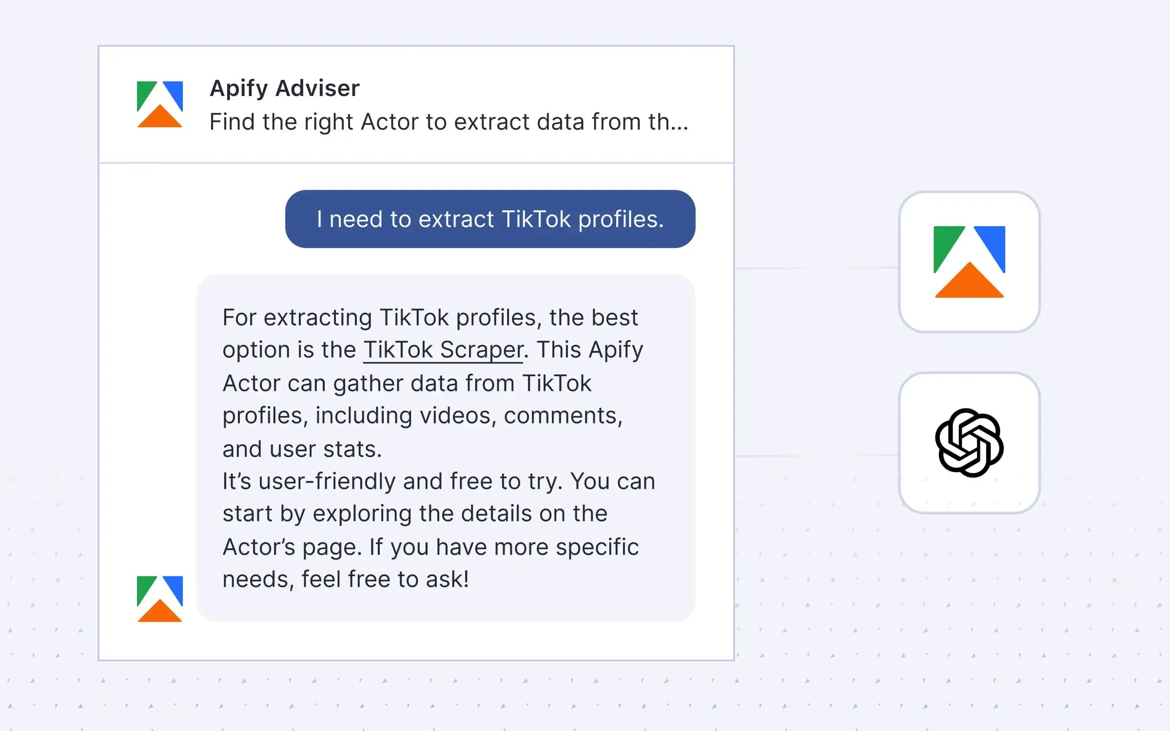Find the right Actor to extract data from the web or get help with the Apify scraping platform. Our Adviser GPT has been trained to assist you with any questions you might have about using Apify or Actors.